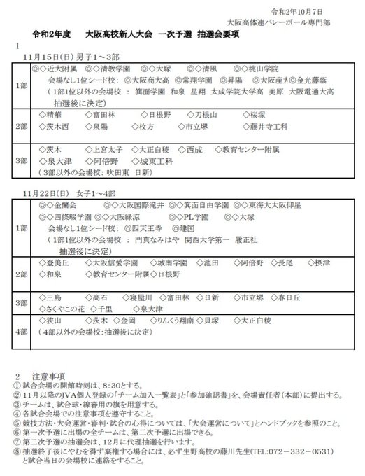 2020新人戦 大阪府高等学校新人バレーボール大会 要項 組合せ